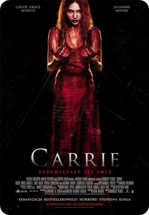 Nastoletnia Carrie White (Chloë Grace Moretz) nie ma łatwego życia. Dziewczyna jest wychowywana przez surową i religijną matkę, Margaret (Julianne Moore), a w szkole jest obiektem nieustannych kpin ze strony rówieśników. Wydarzeniem, które zmienia życie zaniedbanej dziewczyny jest jej pierwsza miesiączka pod szkolnym prysznicem, wtedy Carrie odkrywa u siebie zdolności telekinetyczne. Tymczasem jedna z dziewcząt planuje ośmieszyć Carrie na oczach całej szkoły podczas balu, nie zdając sobie sprawy z konsekwencji jakie wywoła.Książkę czytałam dwa razy i wywarła na mnie spore wrażenie. Parę lat temu próbowałam obejrzeć pierwszą ekranizację powieści, ale kompletnie mi się nie podobała. Kiedy usłyszałam, że ma powstać nowa ekranizacja znanej pozycji Kinga, nie mogłam doczekać się jej premiery na dużym ekranie. A film okazał się mocno średni - wiele fragmentów z książki zostało zmienionych, a unowocześnienie historii wypadło trochę słabo. Poza tym to miał być horror, a na sali dosłownie każdy się zaśmiewał z pewnych scen, a mnie bolał brzuch od ciągłego wybuchania śmiechem. Zdecydowanie przesadzono z ilością efektów specjalnych, a krew, która pod koniec była dosłownie wszędzie i miała pewnie za zadanie nas wystraszyć, bardziej zniesmaczała. Podobała mi się za to gra Julianne Moore, która idealnie sprawdziła się w roli kobiety nieobliczalnej.